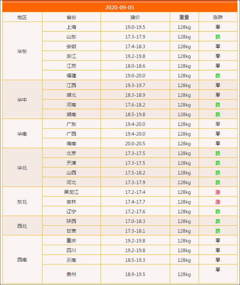 目前,豬價(jià)跌勢持續(xù),不過,下跌范圍以及幅度逐步收窄。據(jù)數(shù)據(jù)統(tǒng)計(jì)顯示,9月5日,全國外三元豬價(jià),在可監(jiān)測的26省市中,豬價(jià)2漲11跌,豬價(jià)大片企穩(wěn)。其中東北兩地豬價(jià)上漲,遼寧豬價(jià)小幅回落,華北、西北以及華中多地豬價(jià)震蕩下行,而西南以及華南多地,豬價(jià)陸續(xù)企穩(wěn)!目前,豬價(jià)跌勢維持在0.05~0.2元/斤,京津兩地,受凍肉出庫影響,余威尚存,豬價(jià)跌幅較大,其余省市豬價(jià)跌勢也逐步收 窄!而在西南地區(qū),受四川大規(guī)模儲備凍肉投放影響,豬價(jià)******企穩(wěn)!